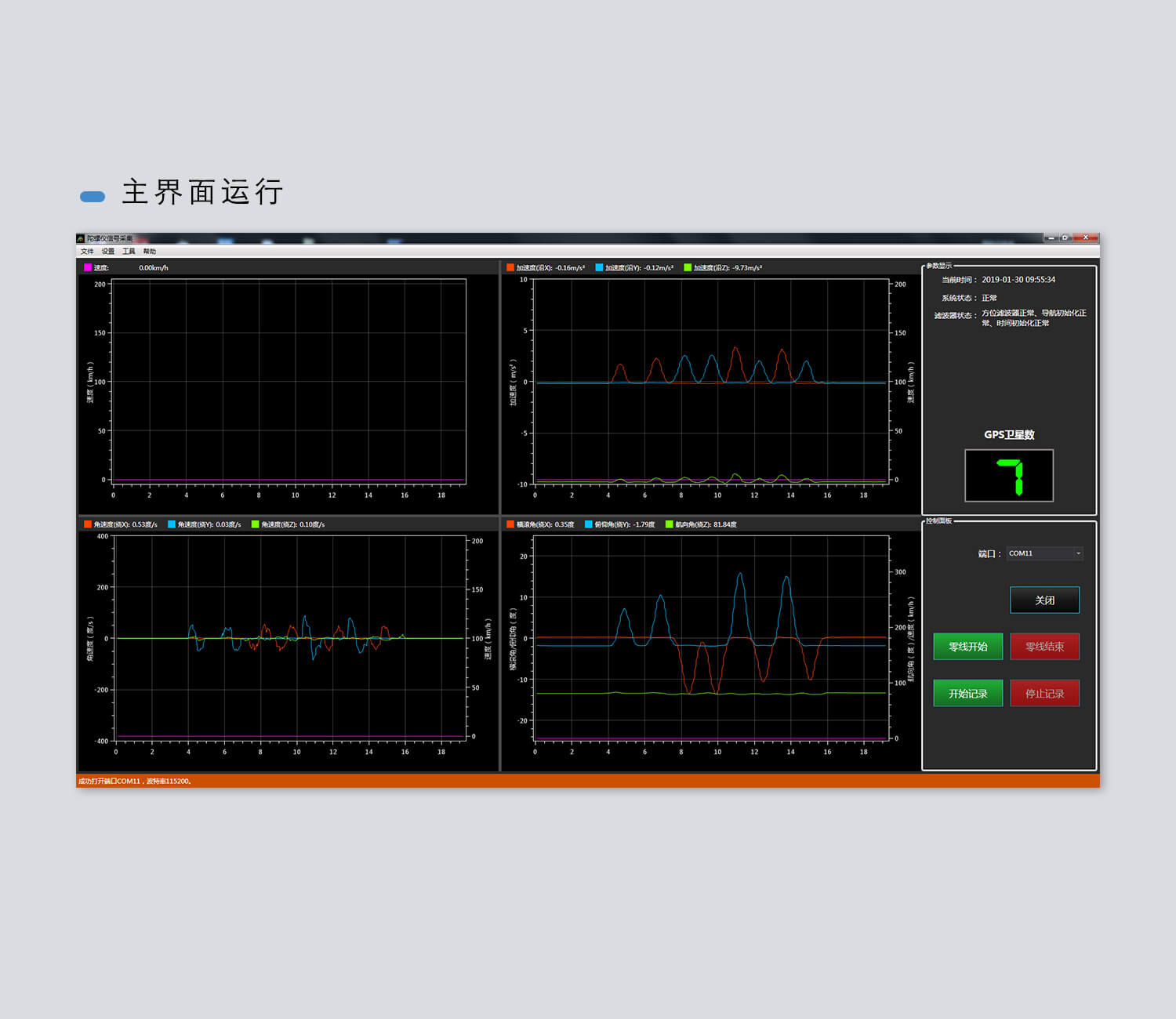 車輛姿態(tài)測(cè)試系統(tǒng)配套有專用軟件,可以將車輛姿態(tài)數(shù)據(jù)以實(shí)時(shí)曲線形式顯示在主界面上,將衛(wèi)星狀態(tài)信息用醒目的文字顯示在狀態(tài)欄。